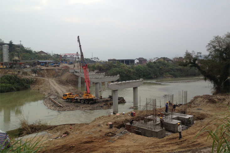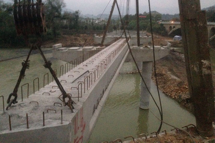 下午16时30分,公司下属机械分公司副经理朱超群、该项目部经理汪承亮下达开始架梁的命令。现场顿时掌声雷动,礼花飞舞。在双滑轮组的匀速滑轮中,空心板梁被缓缓推送到位,徐徐降落固定,经过近40分钟的精心操作,S347炎陵石潮至垄下公路新河漠大桥4#-5#墩5-3#空心板中梁顺利架设成功。